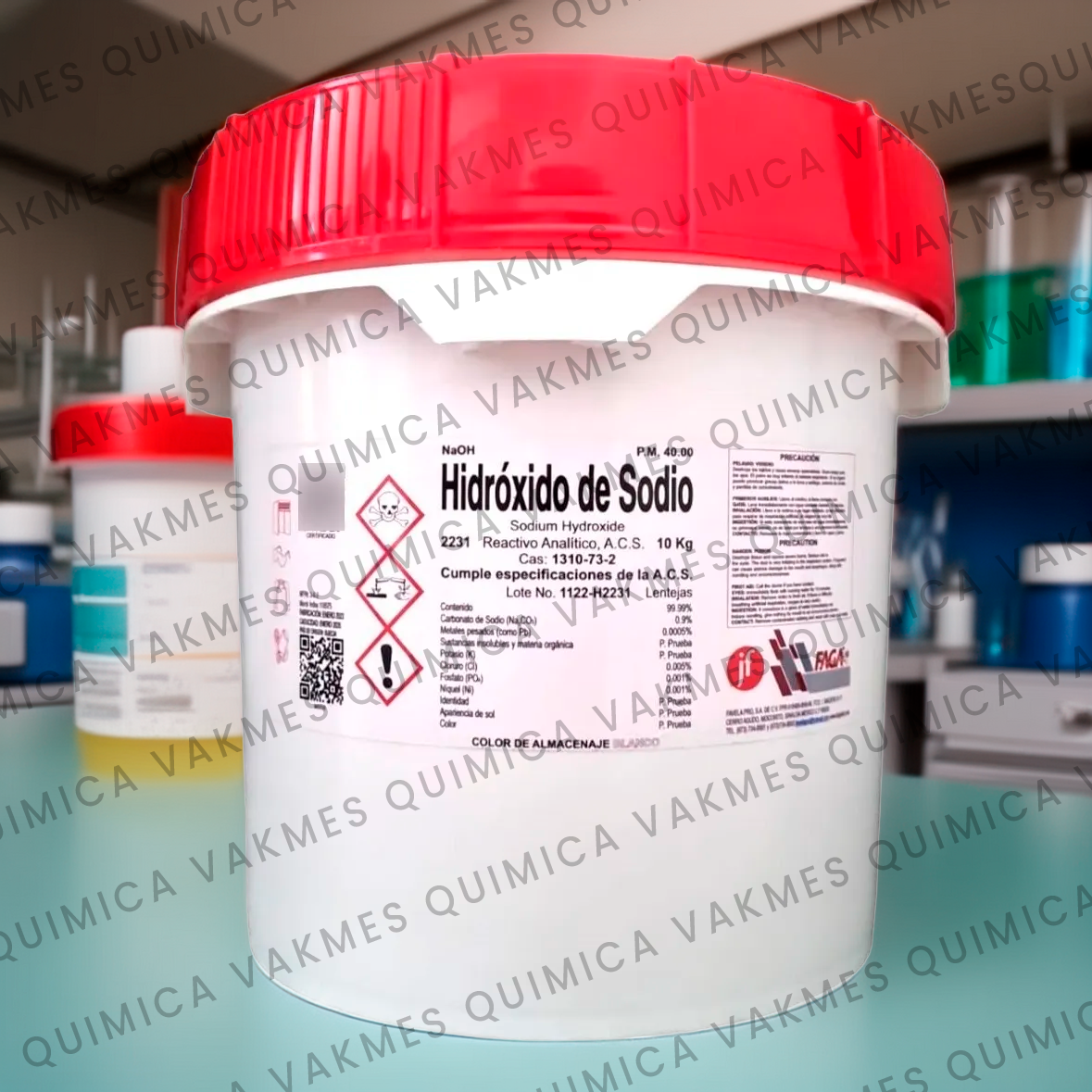 Empacado en balde hermético de 10 kg, el sólido higroscópico mantiene su actividad caústica gracias a un recubrimiento interior anti‑humedad y un sello termoencogible. El formato en escamas facilita la dosificación rápida en titulaciones ácido‑base, preparación de solución alcalina para limpieza CIP, desproteinización de muestras y ajuste de pH en bioprocesos. Su vida útil típica es de 3 a 5 años en almacén seco (< 60 % HR) y temperatura ambiente.